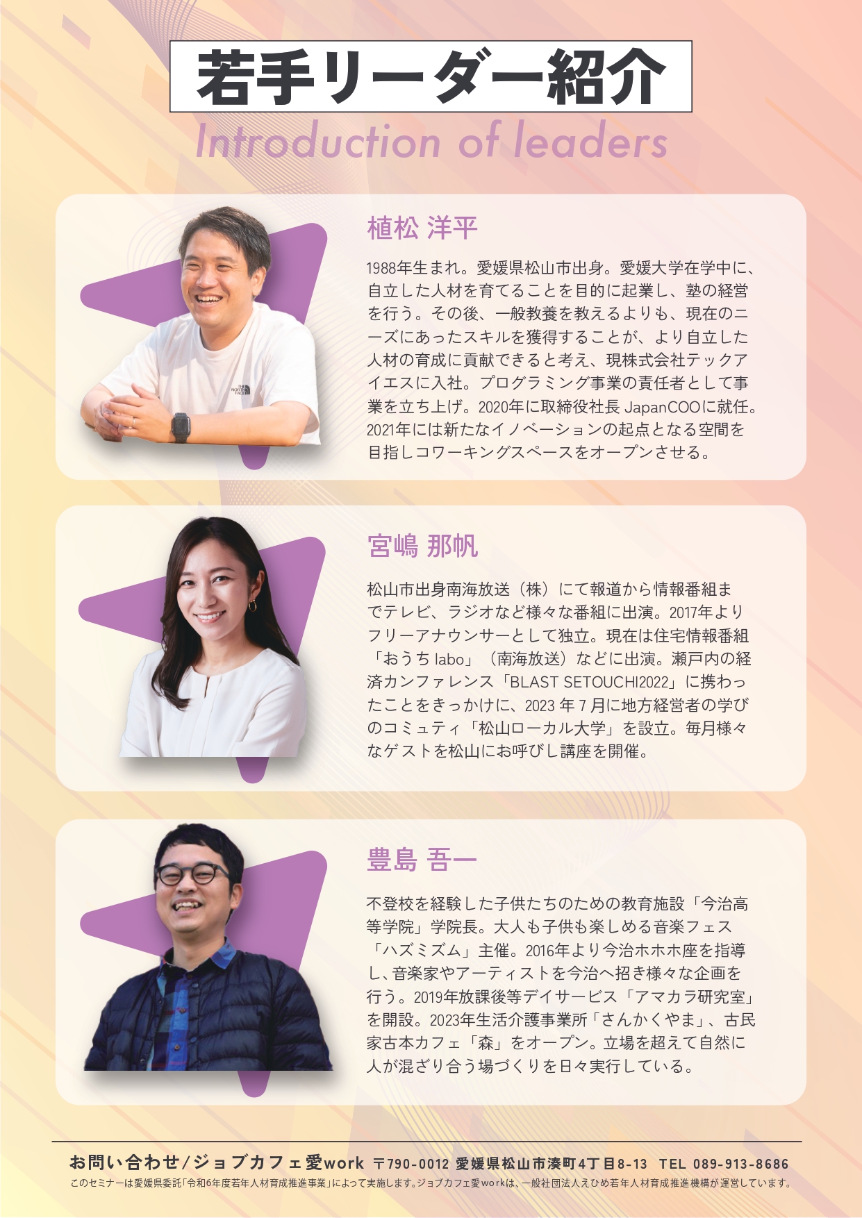 「熱い思いを持った方」「自分にはない視点を持った方」「人生を楽しんでいる人」に出会うとワクワクしませんか?!この愛媛の若手リーダー3人はまさにそんな人達です。