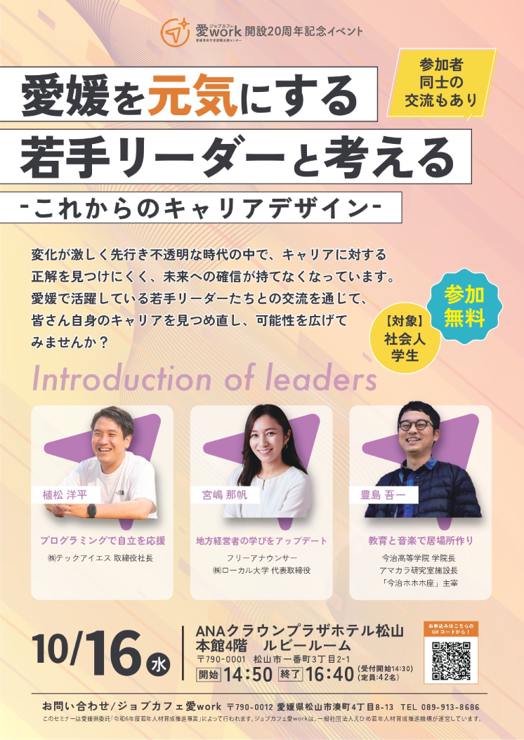 愛媛で活躍するリーダーたちとの交流を通じて、皆さん自身のキャリアを見つめ直し、未来への可能性を広げてみませんか?