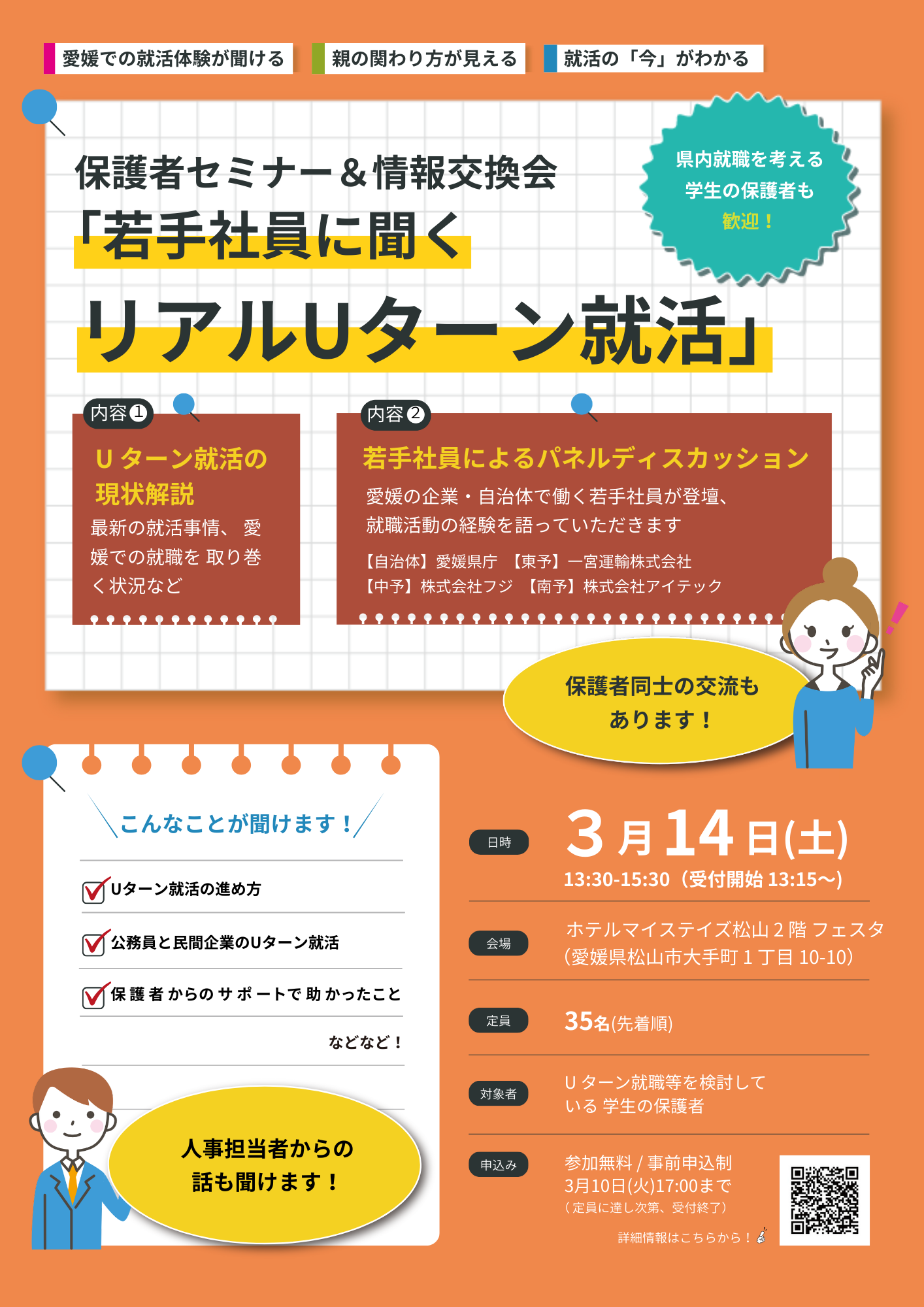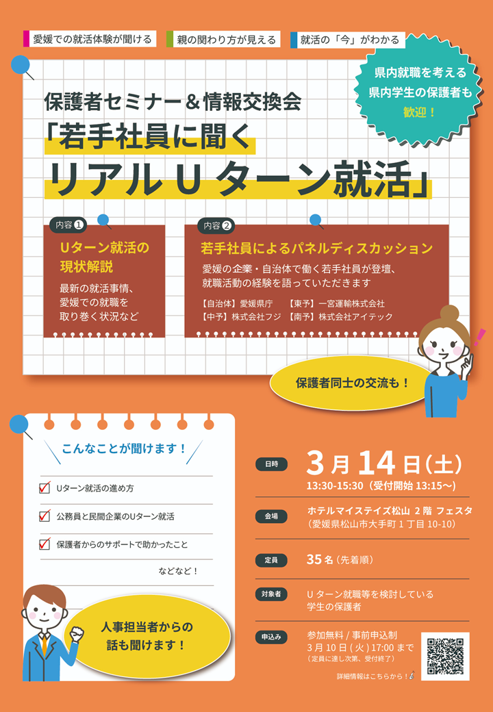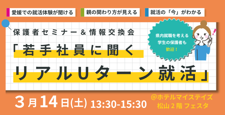 大学生のお子さまを持つ保護者の方を対象に、就職活動の最新動向や愛媛で働くという選択肢について知っていただくイベントを開催します。就職活動の早期化が進む中で、「いつから」、「何を知っておけばよいのか」と不安に感じる大学生や保護者の方は少なくありません。