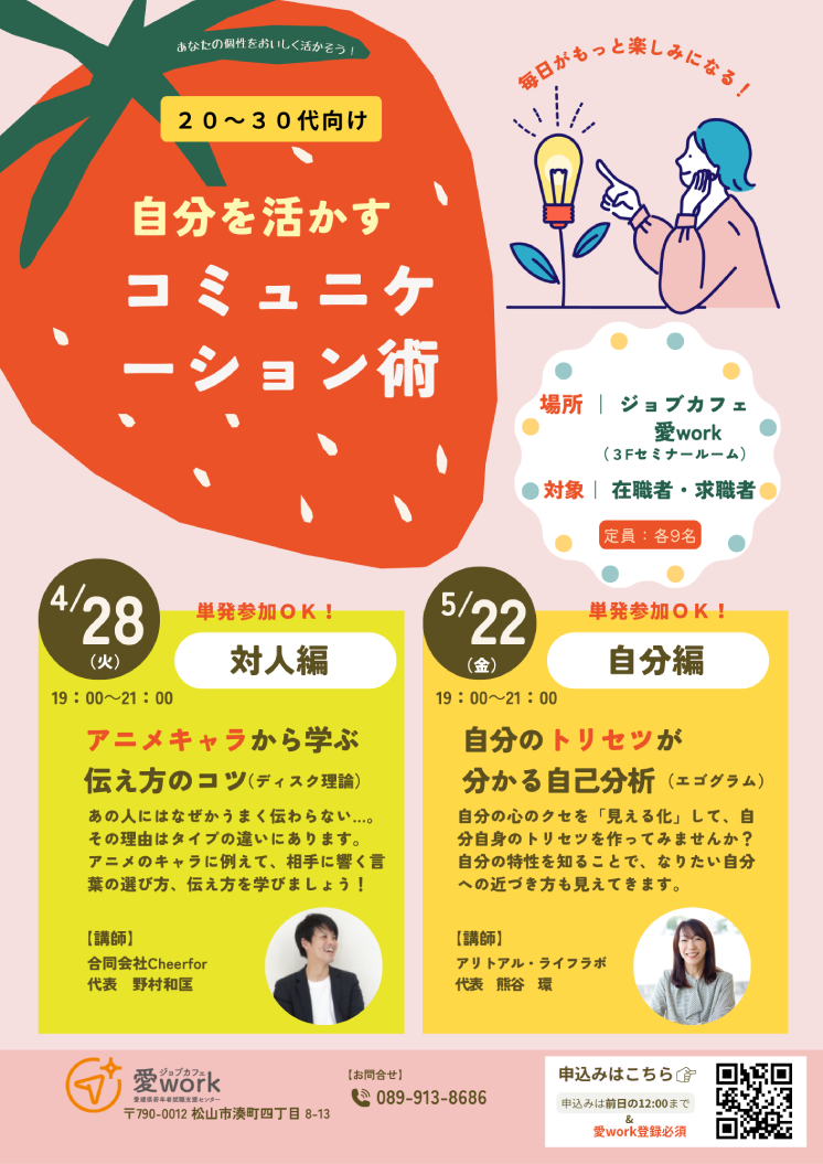 「人付き合いに正解を求めて疲れてしまう」……そんな方にこそ、試してほしいセミナーです。自分の特性を知り、相手との「違い」を整理できれば、対人関係のストレスはぐっと減らせるはずです。 肩の力を抜いて、まずはリラックスして参加してみませんか?皆様のご参加を、心よりお待ちしています。