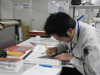 現在は現場監督補佐として、先輩の下で勉強の毎日の吉田さん。現場でも敬意を持って取り組むことを大切にし、挨拶を心掛けているそう。もうすぐ出来上がるぞという時が楽しみで、完成品を見たときの嬉しさが堪らなく、やりがいに繋がっているとのこと。目標は自分一人で現場を見れるようになること、そのためにも5年後には1級建築施工管理技士の資格を取りたいと熱く語っていた。社内には笑顔が溢れ、明るい雰囲気が感じられた。