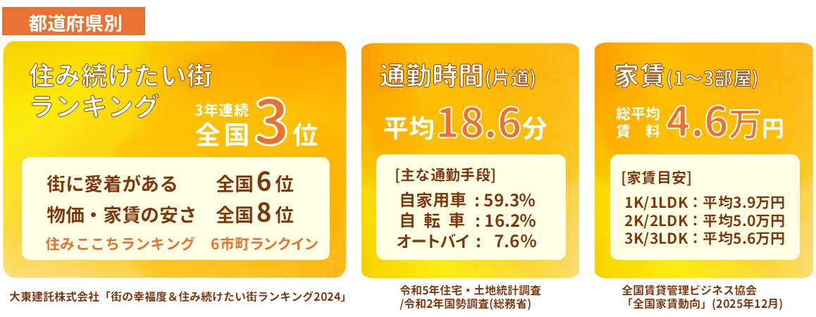 バスや電車、道路などの交通網が充実していることもあり、通勤時間の短さは全国トップクラス。