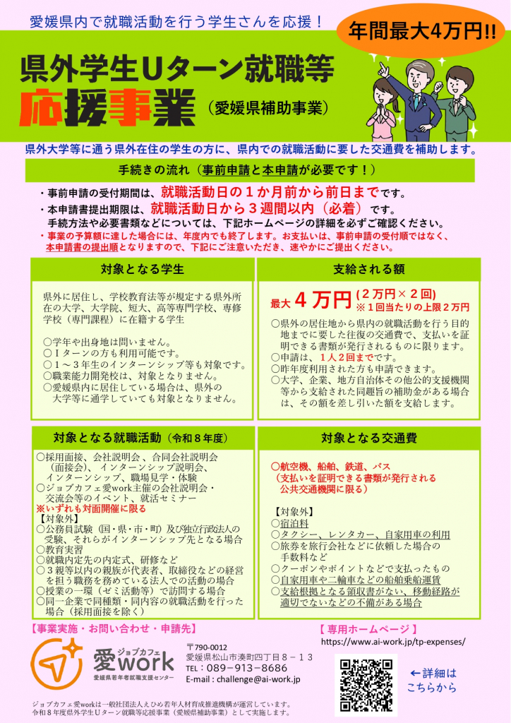 専用ホームページ:愛媛県での就職活動に交通費補助(県外学生対象)
